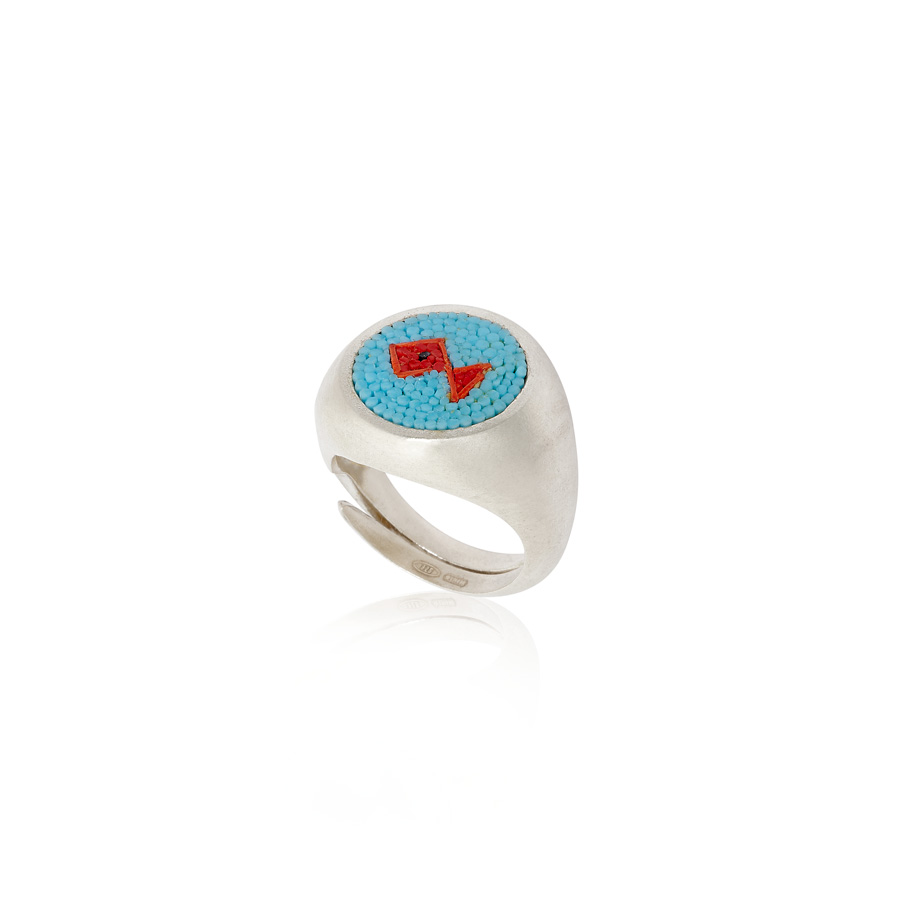 Anello chevalier genderless con misura aggiustabile, realizzato in Mosaico Minuto Romano e Argento 925 satinato.
